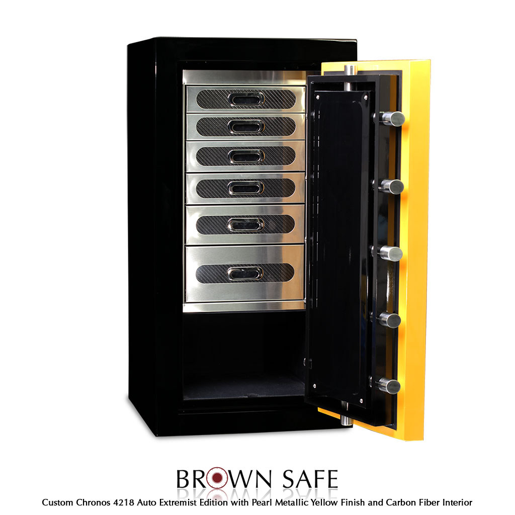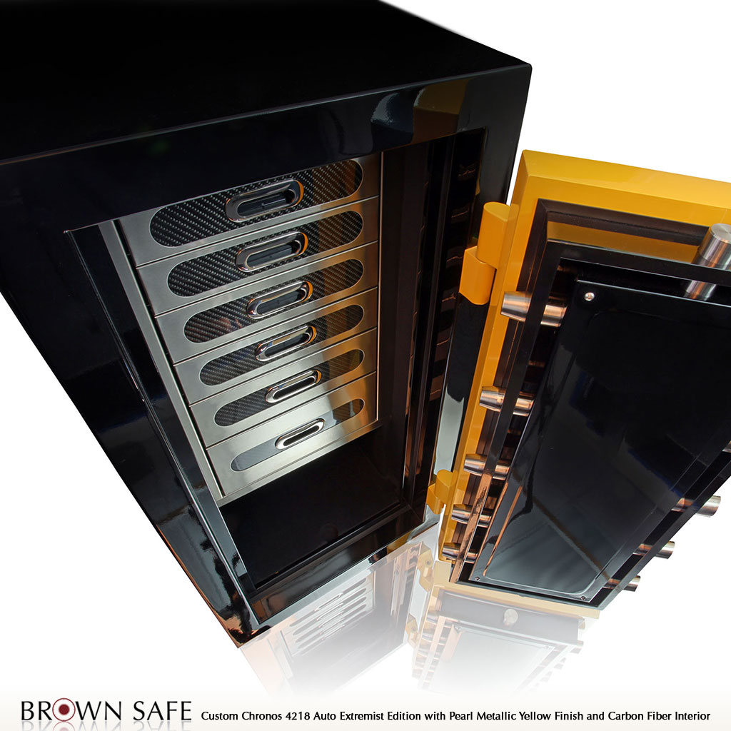 Based on a Chronos series 4218, this custom safe received a two tone high-gloss paint scheme with a metallic black body and pearl metallic yellow door, carefully color matched to the owner's prized vehicle. The interior was customized with carbon fiber accents to further accentuate the high performance look of this custom safe.