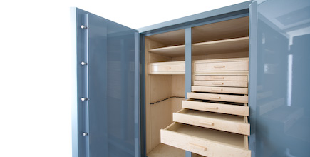 Image Description: Estate 7256 C Interior Package E in Custom Blue with Curly Maple Interior and Sand Ultrasuede